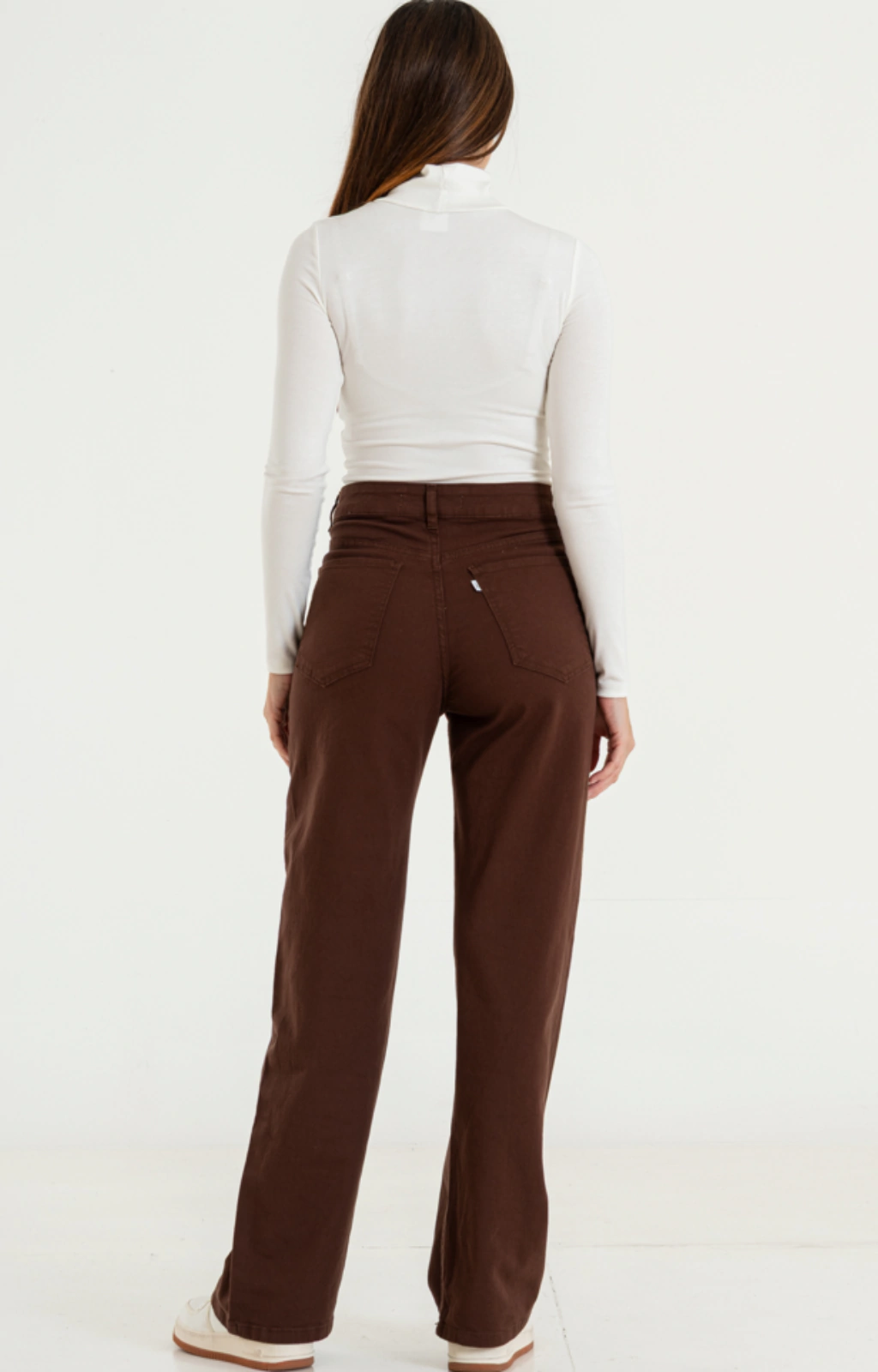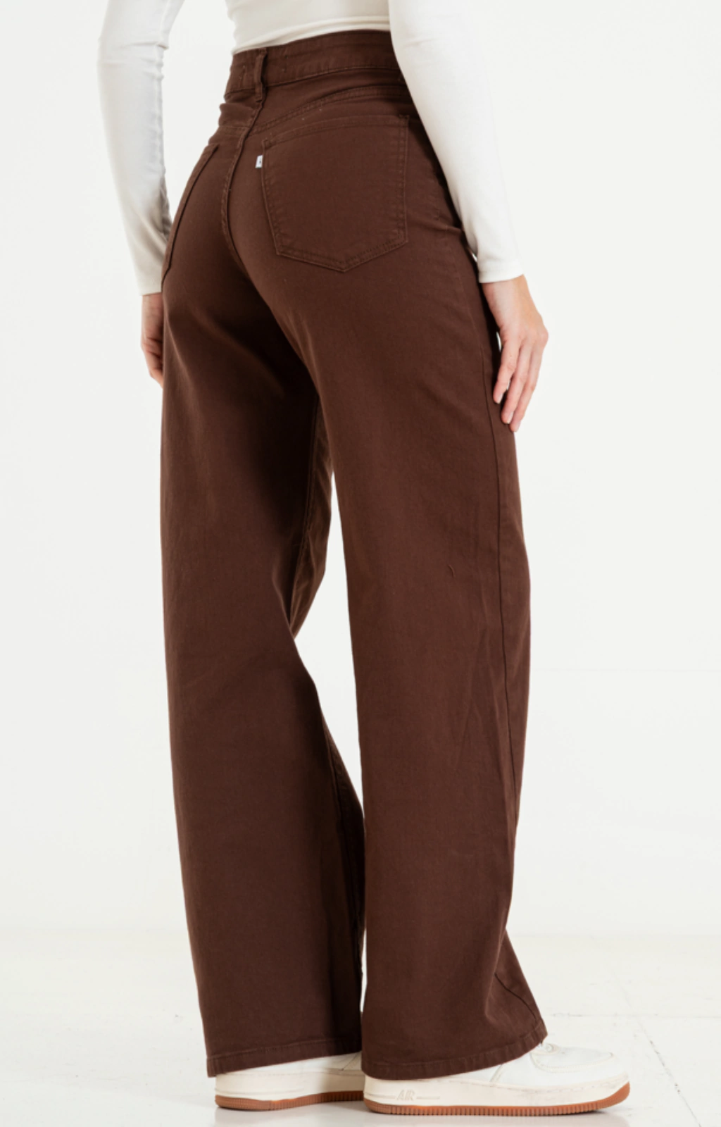 El Jean Glynne es tu nuevo aliado si buscás un corte cómodo, moderno y que estilice. Tiene pierna ancha recta, tiro alto y un color marrón chocolate que levanta cualquier look de temporada. El denim es semi elastizado: acompaña sin marcar.